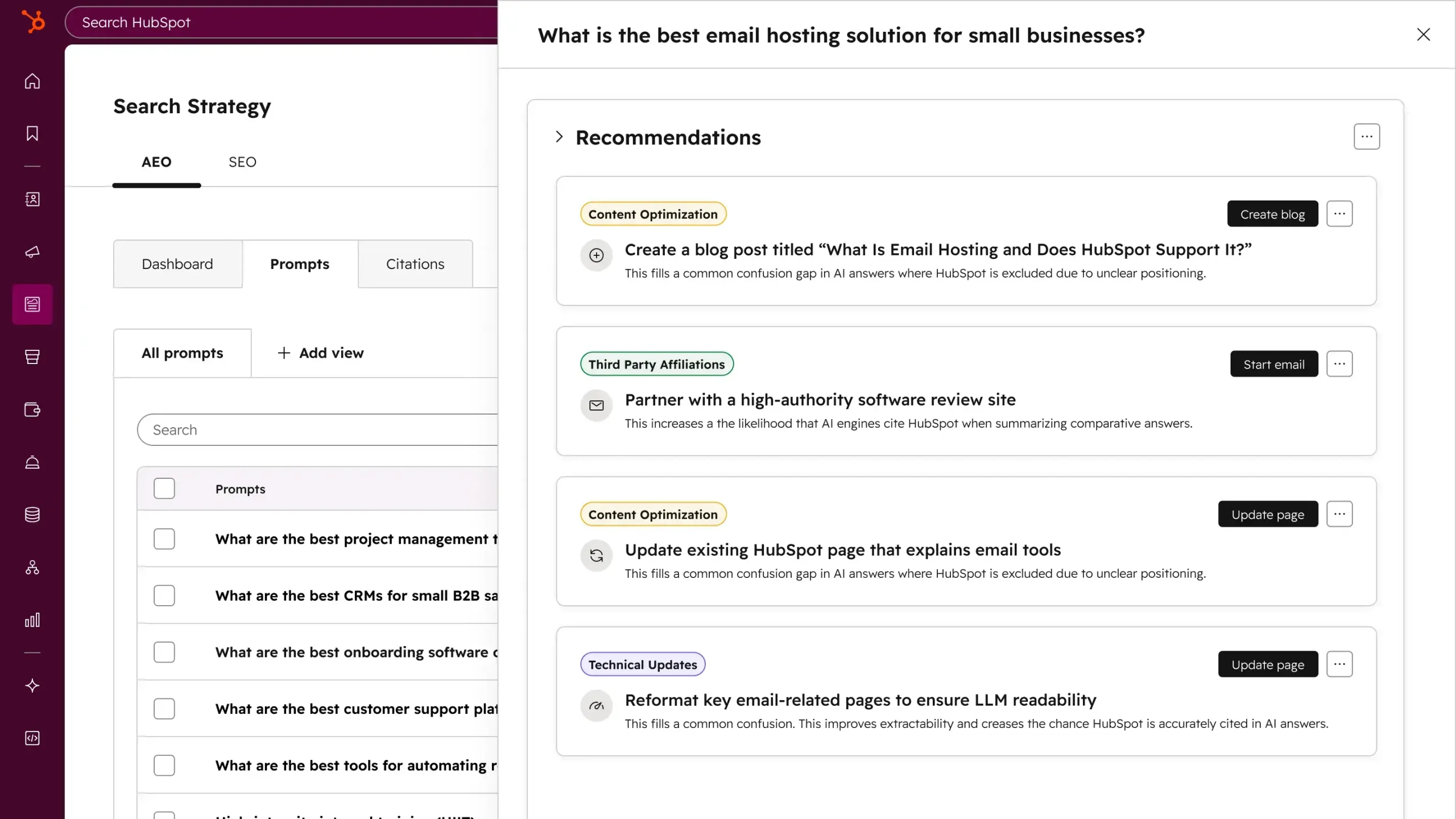 Avoir des données, c’est bien. Savoir quoi en faire, c’est mieux. HubSpot AEO ne se contente pas de dresser un constat de ta visibilité ; il te dicte une feuille de route. Si l’outil détecte que tes concurrents te volent la vedette sur Gemini pour une requête spécifique, il va te générer des recommandations concrètes.