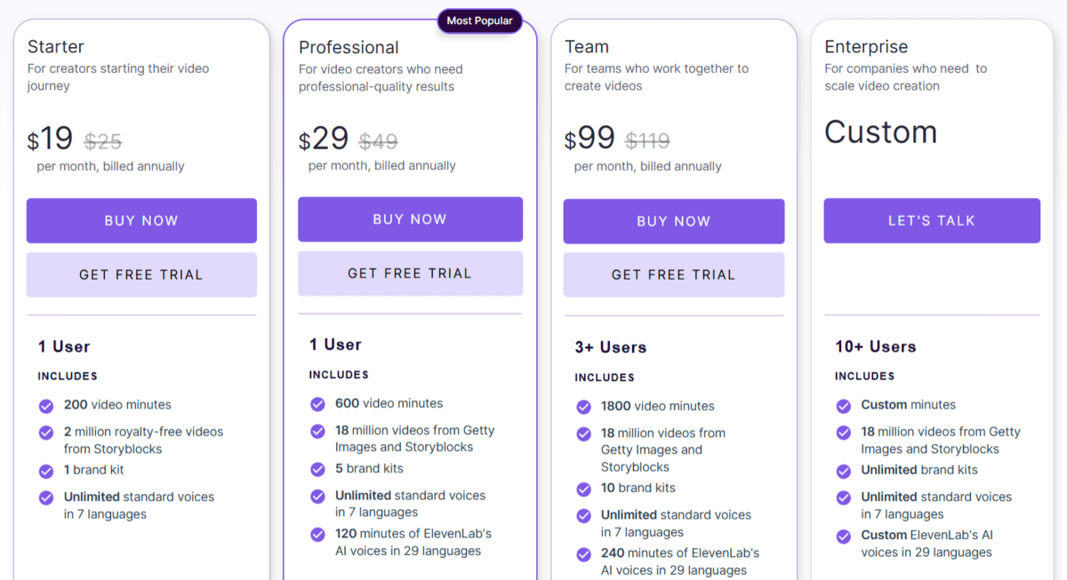 Pictory AI est disponible sous 3 formules d’abonnement (tarifs à l’année) :