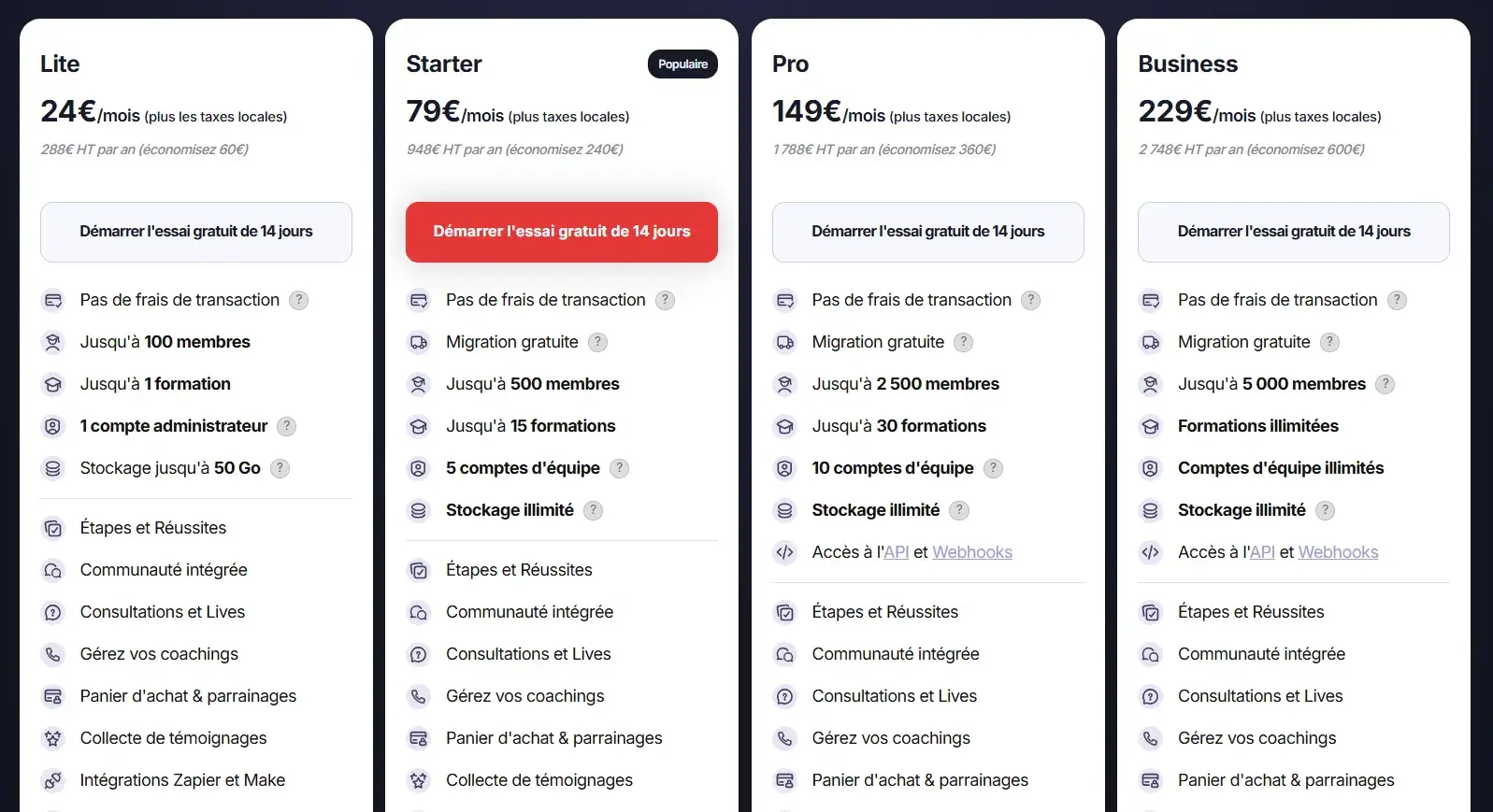 - Starter : 79 € / mois pour 500 membres, 15 formations, 5 comptes
